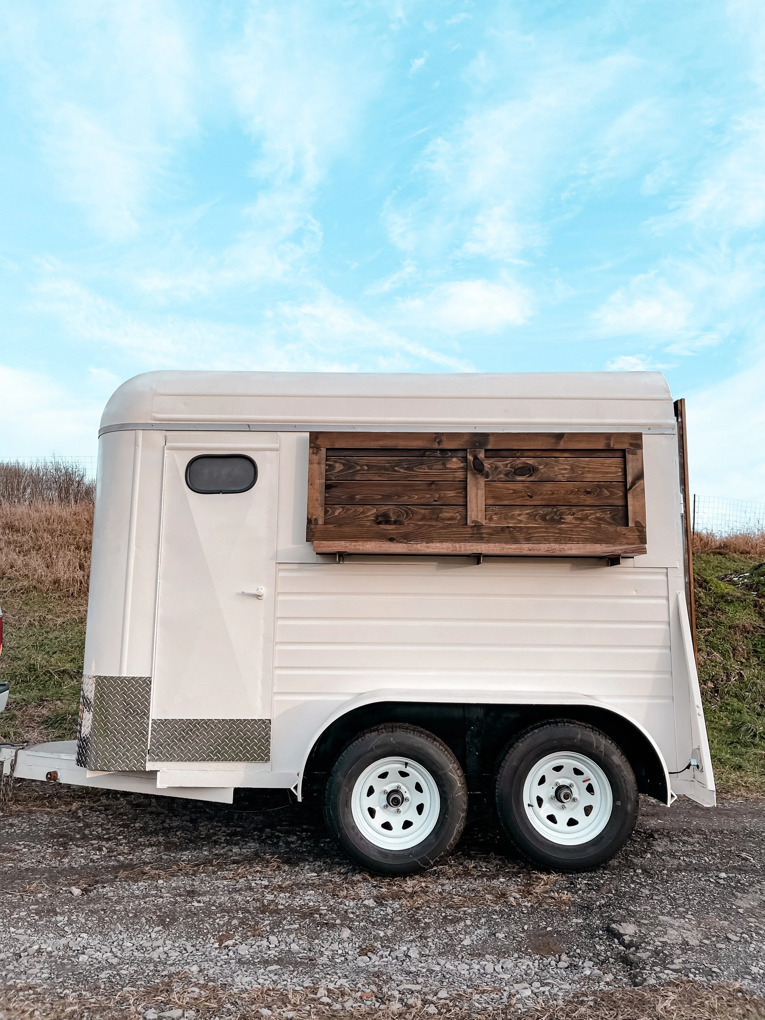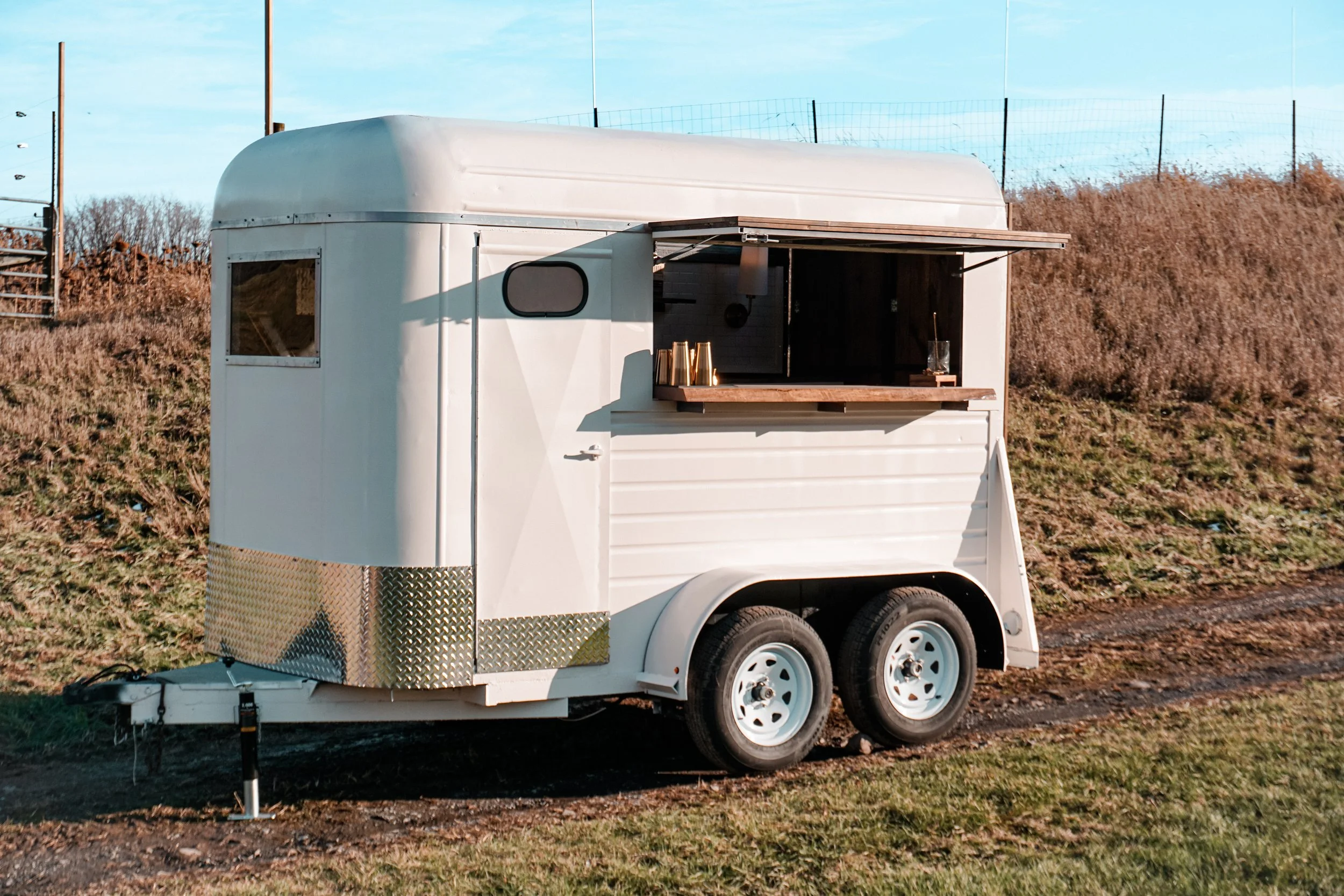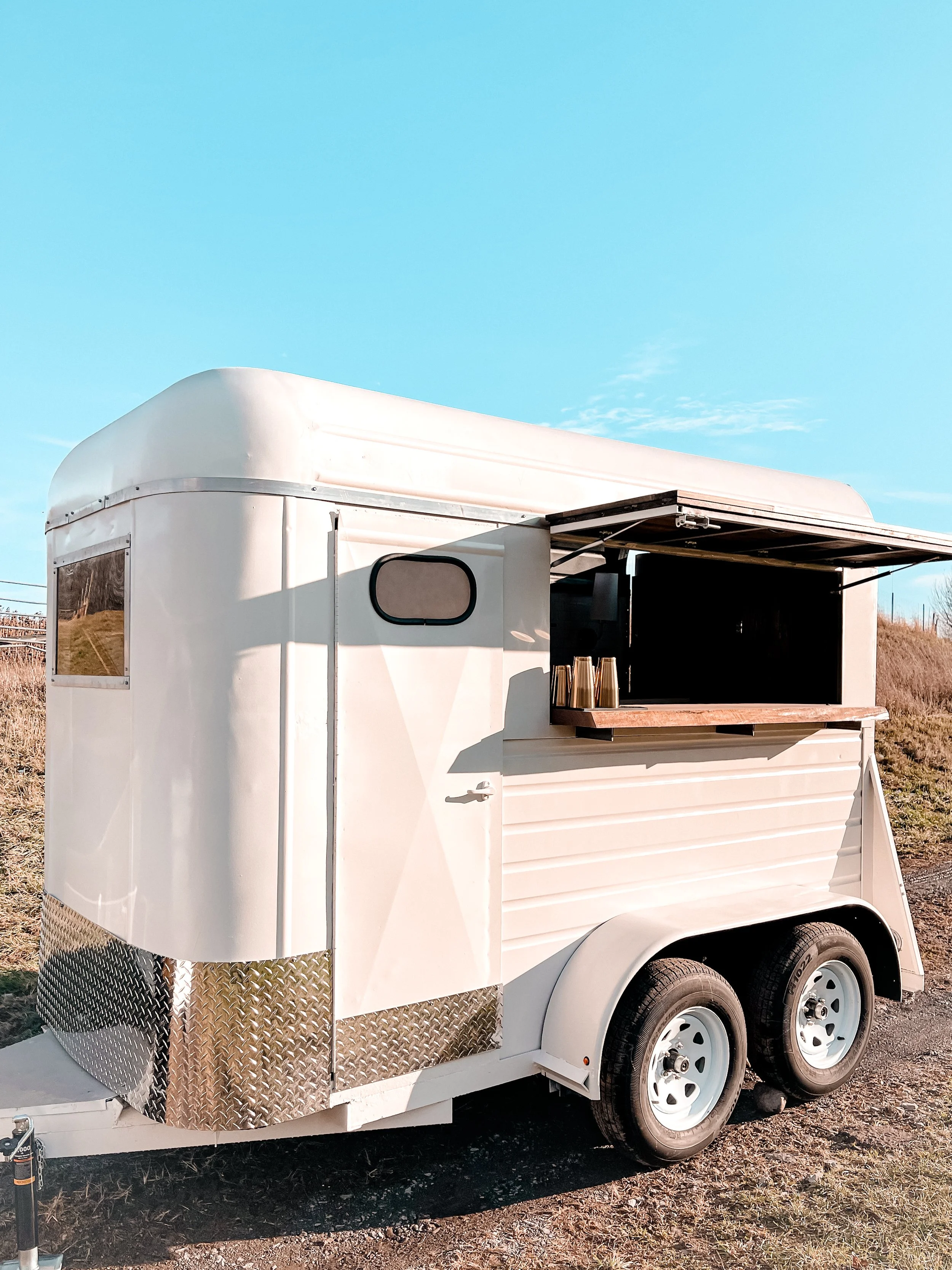 A white mobile trailer converted into a small coffee or bar stand, with an open serving window and wooden shelves, parked on grassy terrain under a clear blue sky.