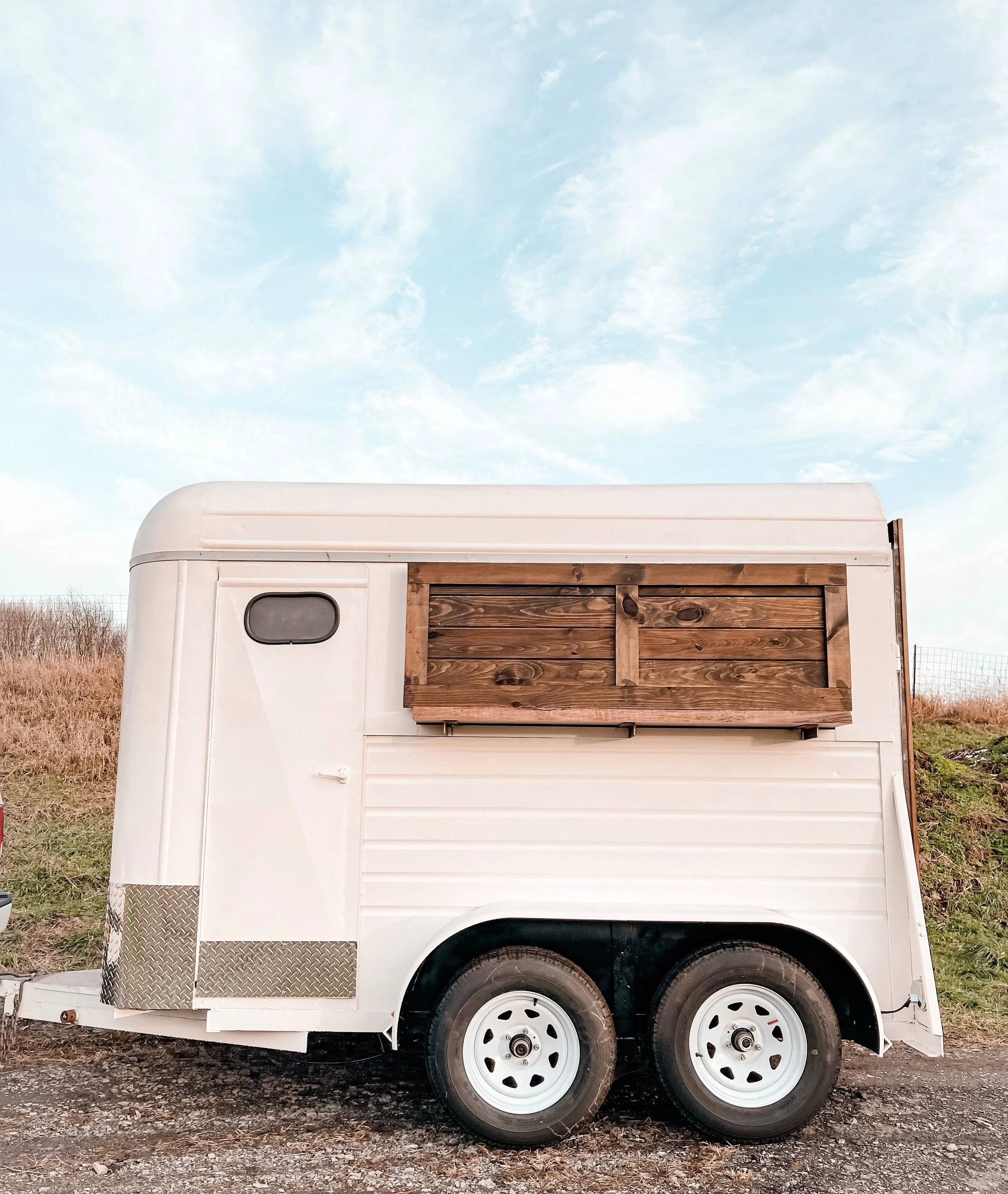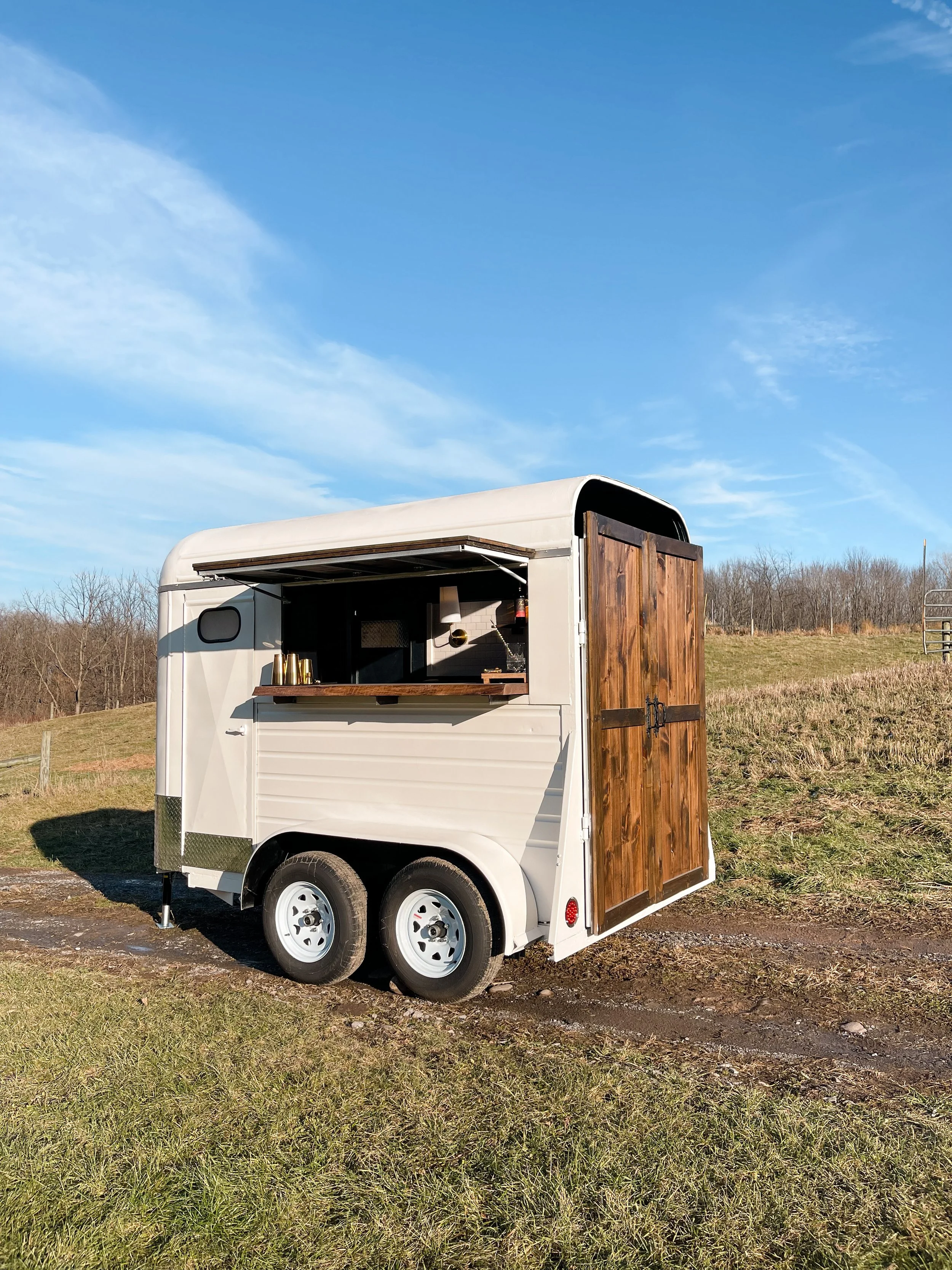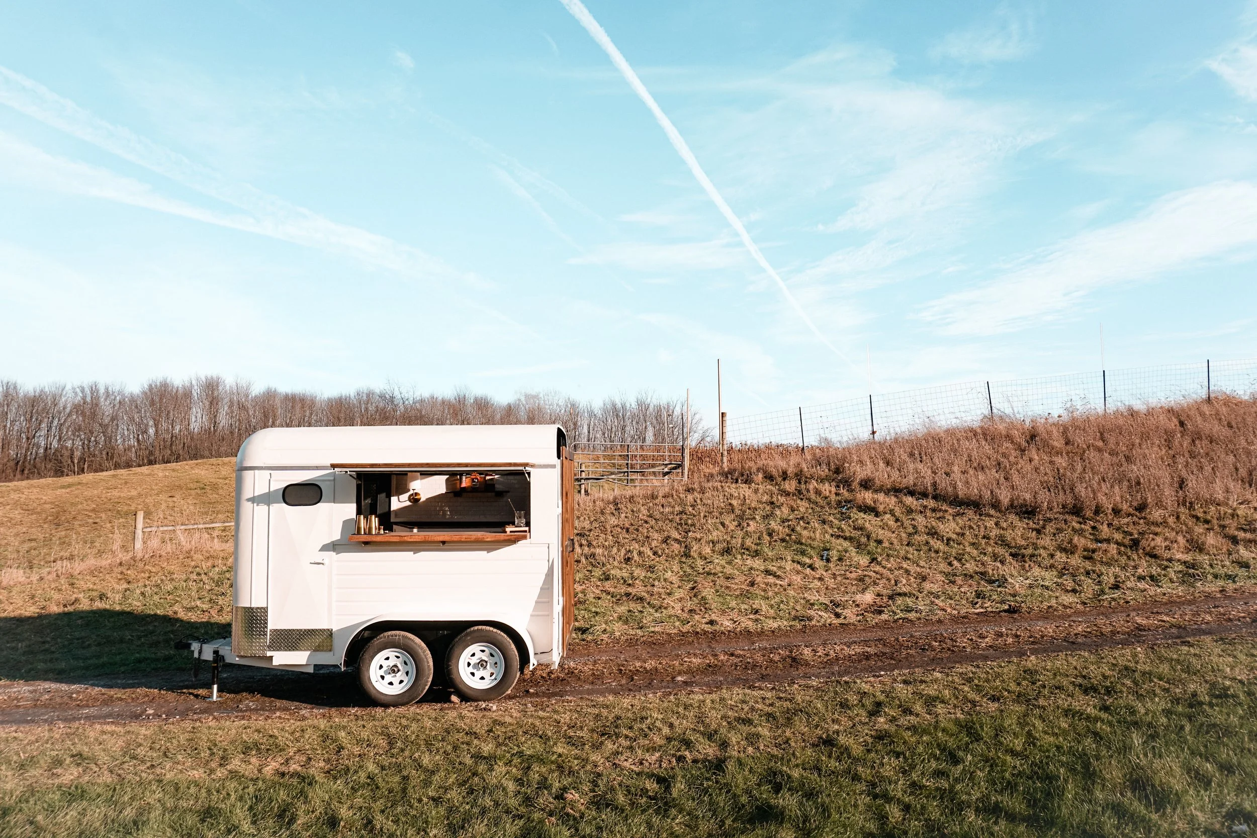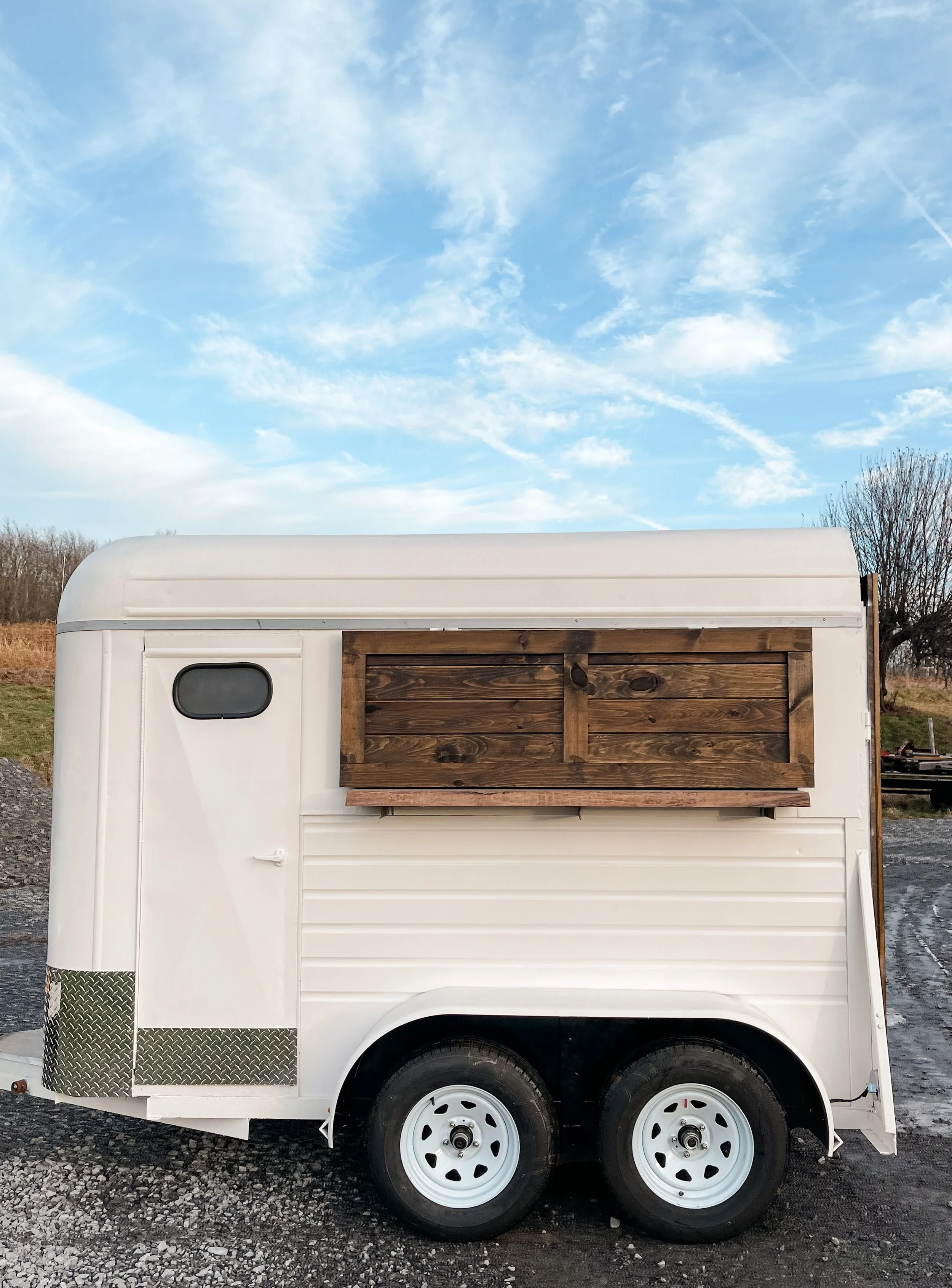 A white mobile trailer converted into a small coffee or bar stand, with an open serving window and wooden shelves, parked on grassy terrain under a clear blue sky.