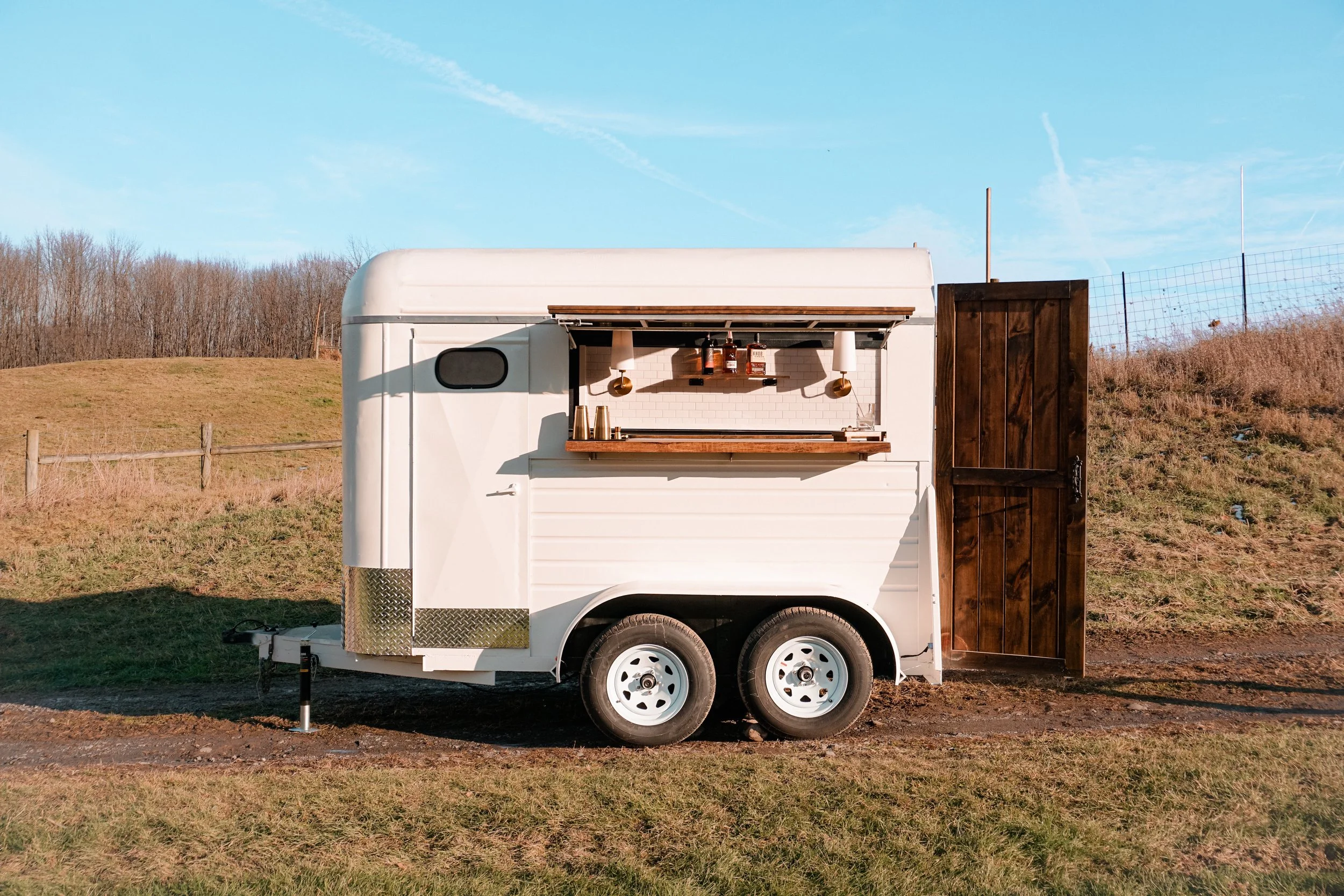 Mobile bar trailer with open serving window in a grassy field under a clear blue sky.