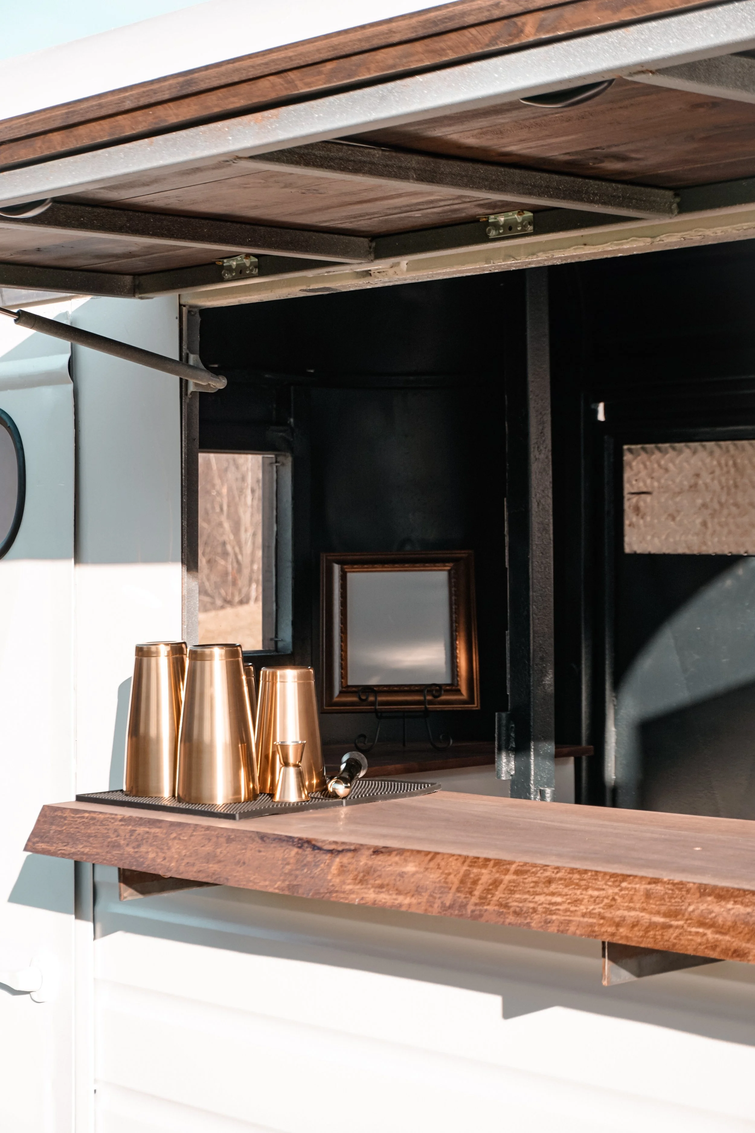 Mobile bar setup with wooden serving counter, gold cocktail shakers, liquor bottles, and glassware displayed under an awning.