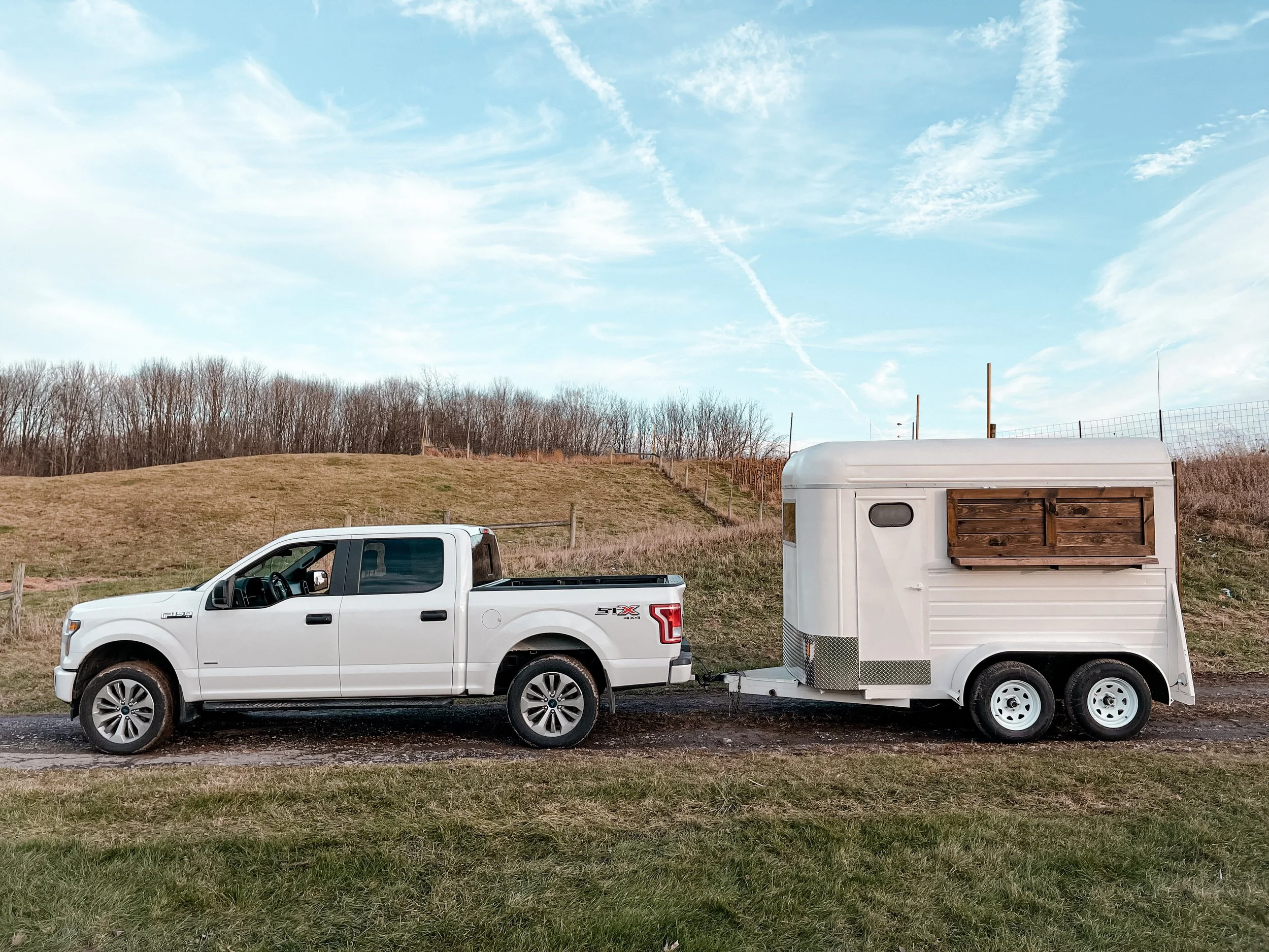A white horse trailer with wooden shutters, parked on a gravel road under a blue sky.