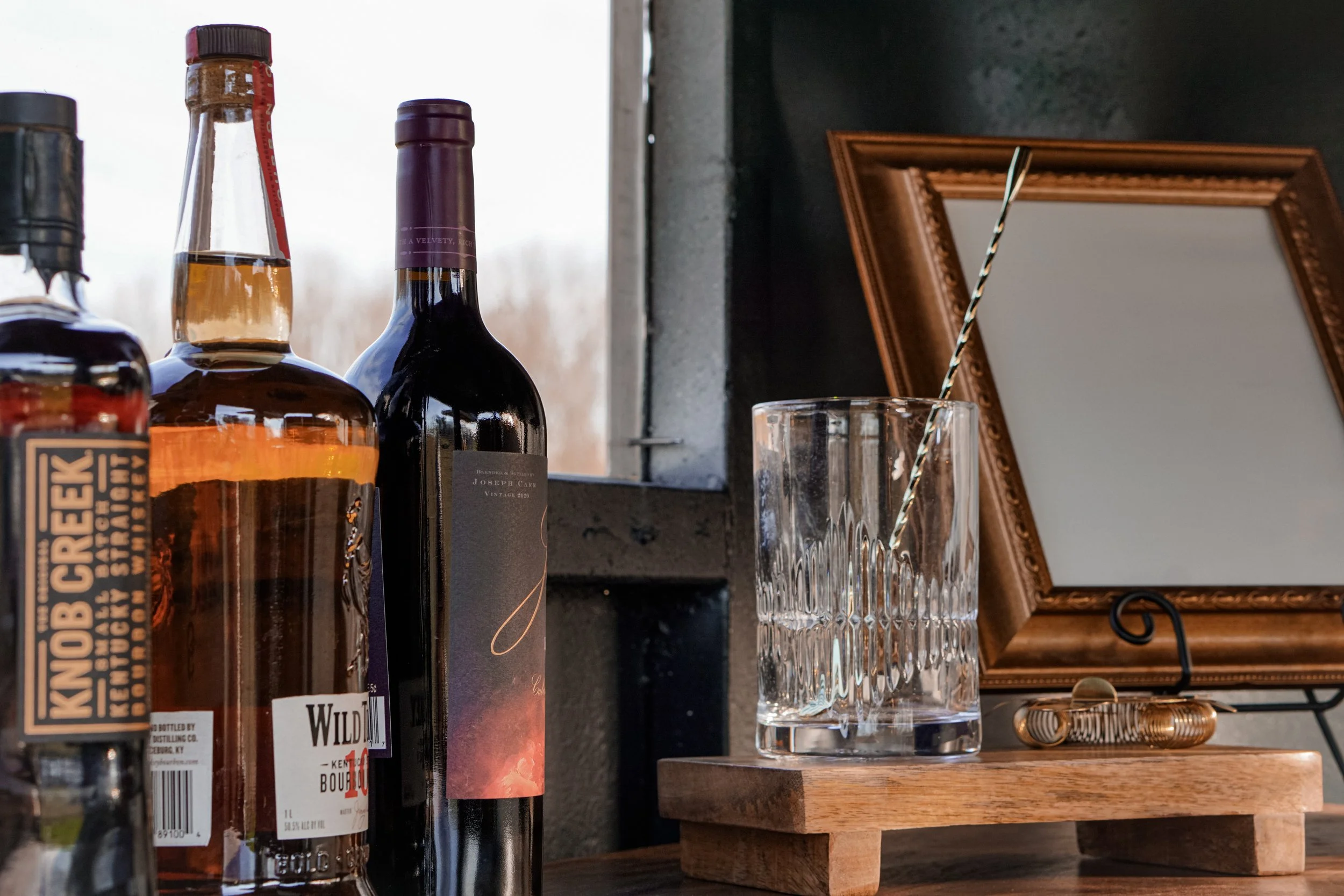 Bottles of liquor and wine on a bar counter with an empty glass, a metal straw, and a framed mirror.