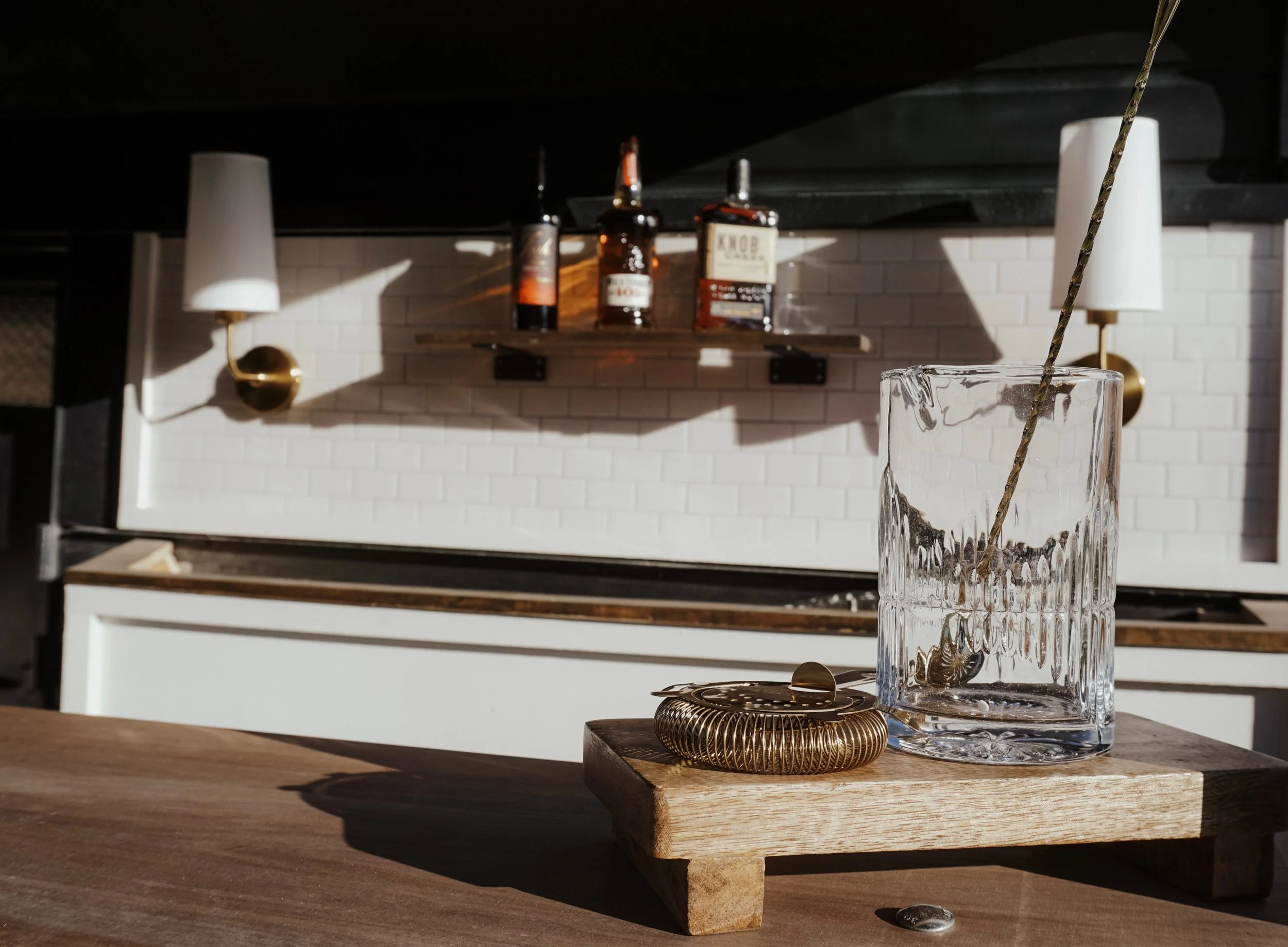 Bar counter with glass, metal strainer, and liquor bottles in the background